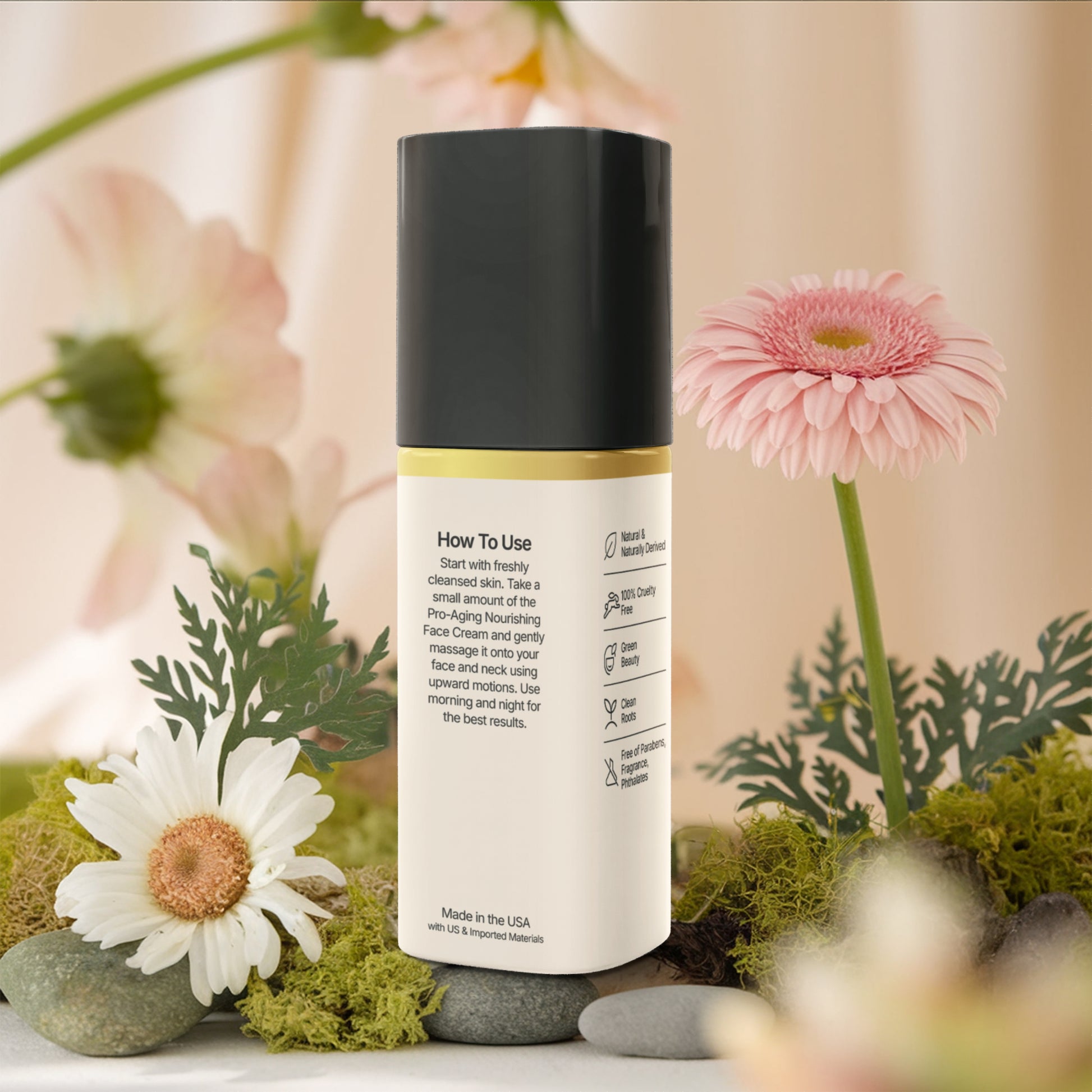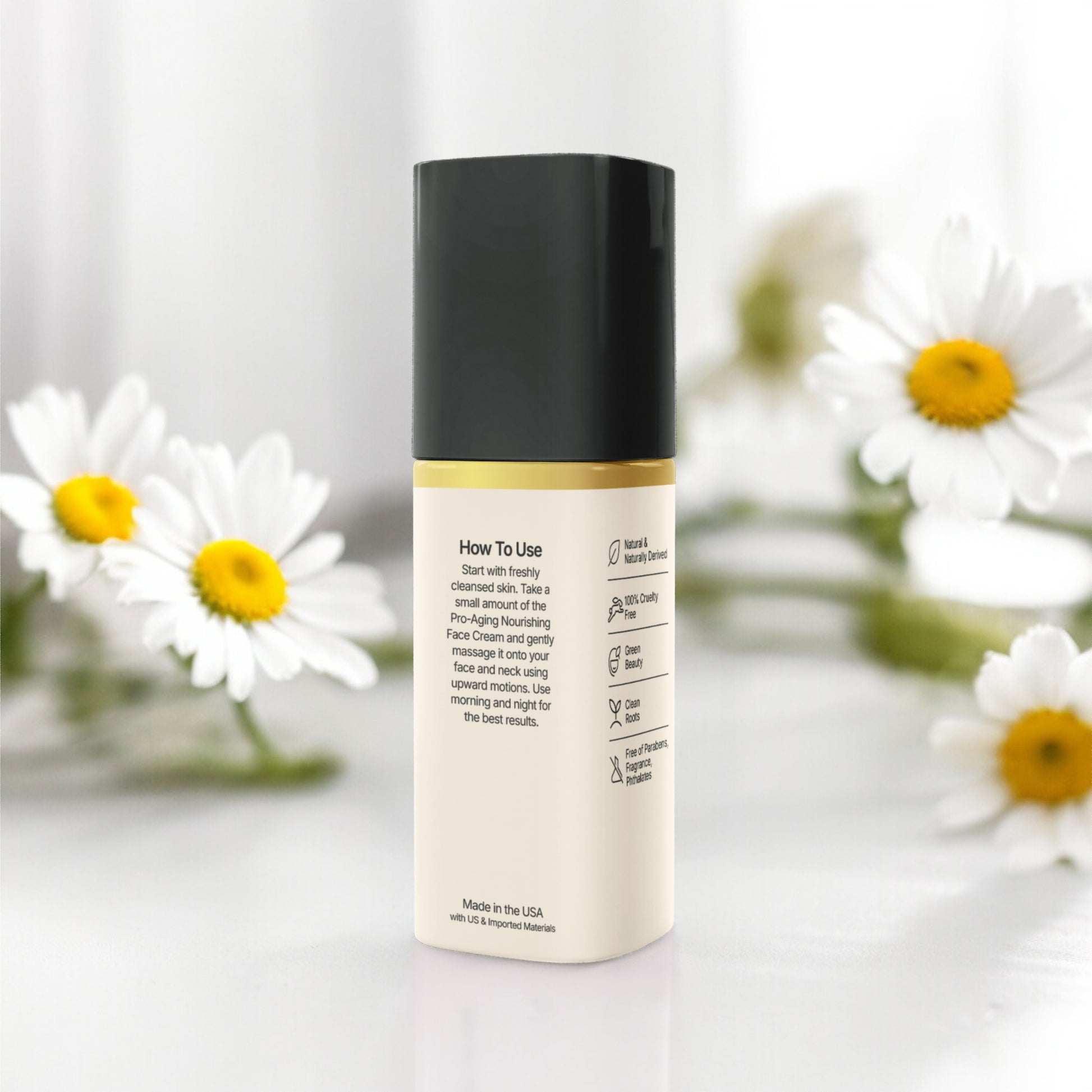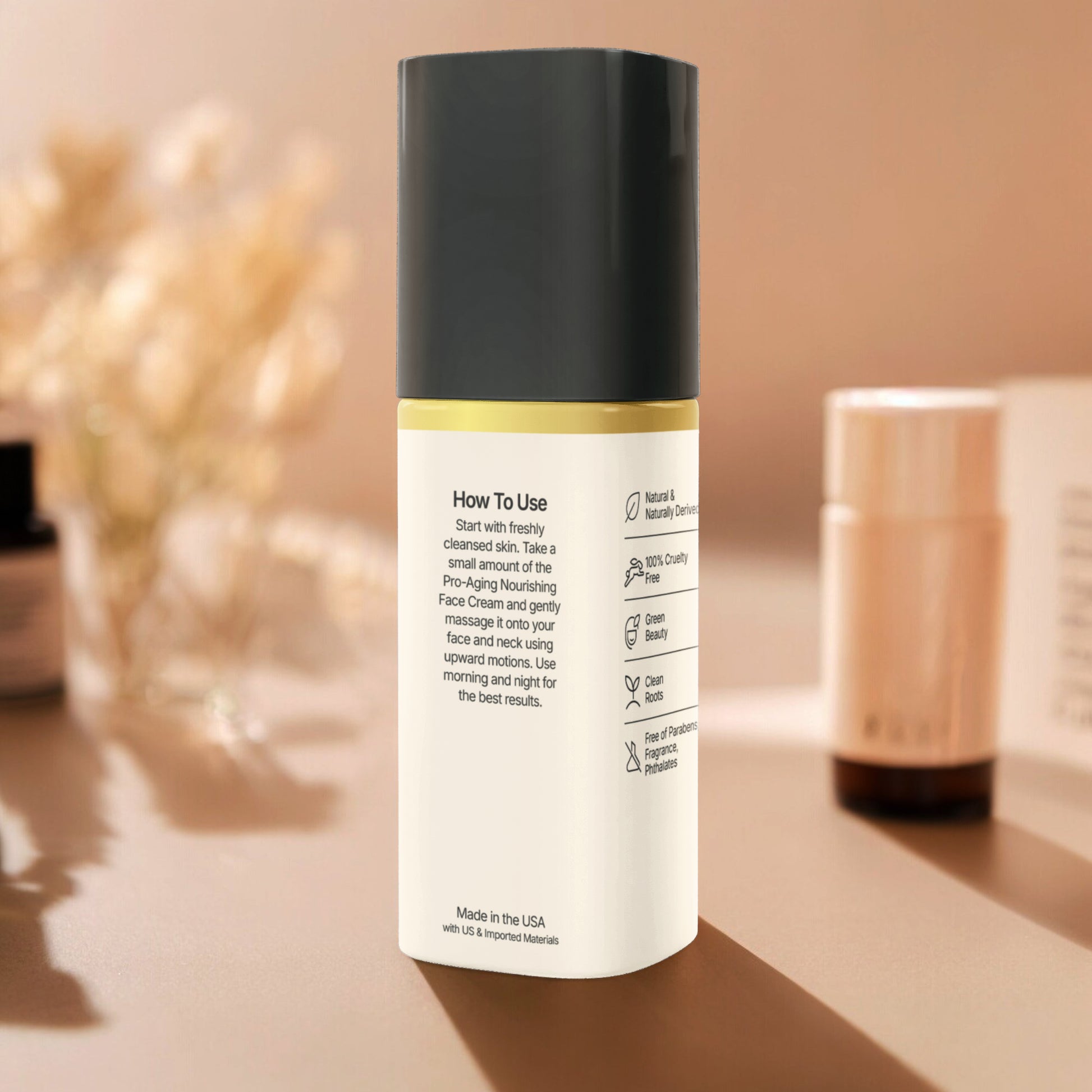 Start with freshly cleansed skin. Take a small amount of the Pro-Aging Nourishing Face Cream and gently massage it onto your face and neck using upward motions. Use morning and night for the best results.